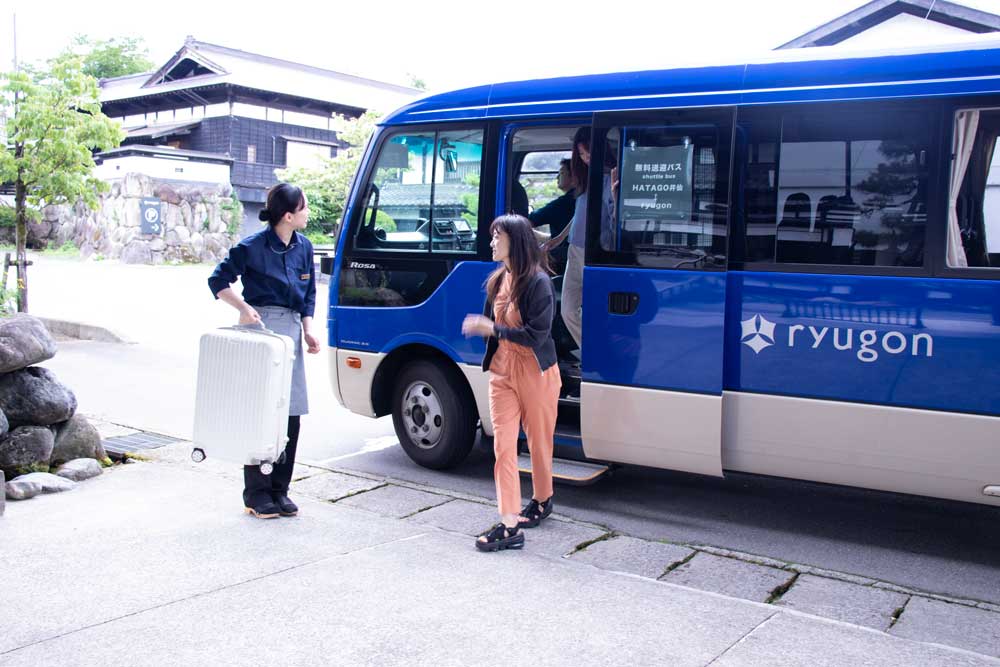 HATAGO井仙からryugonへ、無料のシャトルバスを運行しています。乗車時間は25分。魚沼の山々や田園風景が楽しめるルートを走りますので、移動中は車窓風景もお楽しみください。