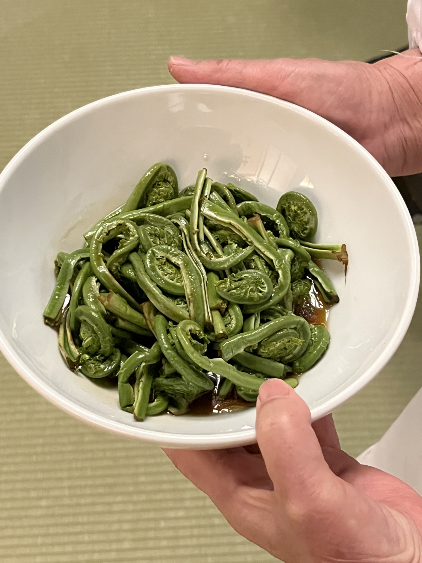 そしてこちらはわらび。わらびも最高ですね。さっとゆでて塩漬けにする方法と、ゼンマイのように干す方法とどちらもします。